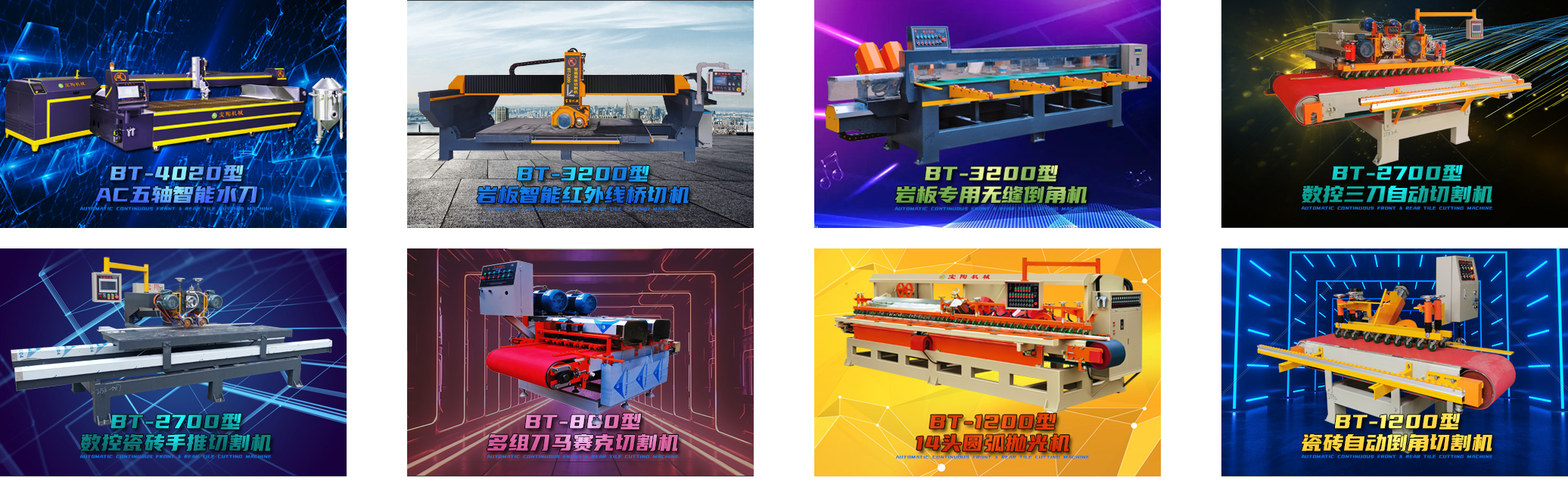 公司產(chǎn)品覆蓋石材巖板陶瓷切割加工需求,包括智能巖板紅外線橋切機、巖板專用無縫倒角機、智能AC五軸水刀4020型、數(shù)控三刀自動切割機、陶瓷大板手推切割機、瓷磚自動內(nèi)倒角機、14頭圓弧拋光機等。