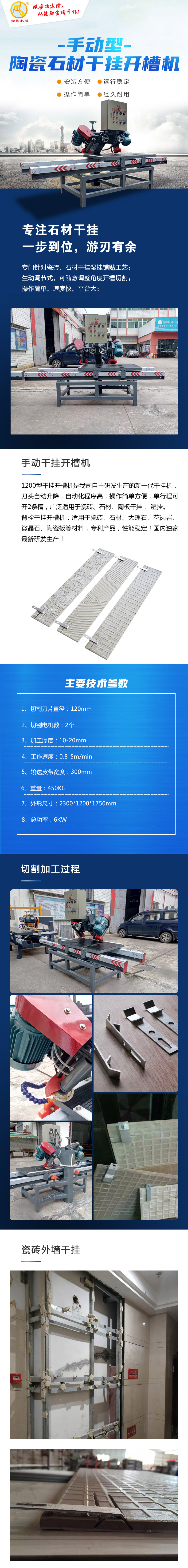 BT-1200手動型瓷磚干掛開槽機采用雙刀頭氣動自動感應控制升降,由行程開關(guān)自動控制切割距離,自動化程度高,可左右上下調(diào)節(jié),角度大小也可調(diào)節(jié),操作方便,加工燕尾干掛效果好,不崩邊不掉角,是石材、瓷磚干掛加工工藝首選設(shè)備,是我司自主研發(fā)生產(chǎn)的新一代干掛加工設(shè)備。