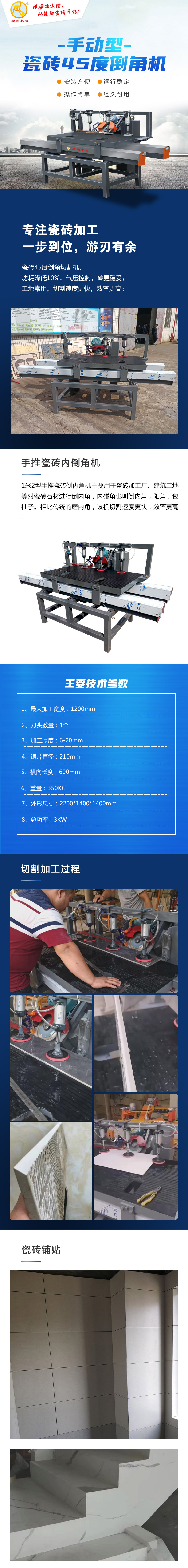1200型手動(dòng)45度倒角機(jī)主要是用來把瓷磚的邊倒45度角,方便V型上墻,裝飾更加美觀,適用在瓷磚加工廠、建筑工地等對(duì)瓷磚石材等材料倒角,內(nèi)碰角也叫倒內(nèi)角,陽角,包柱子。相比傳統(tǒng)的磨內(nèi)角,該機(jī)切割速度更快,工作效率更高。