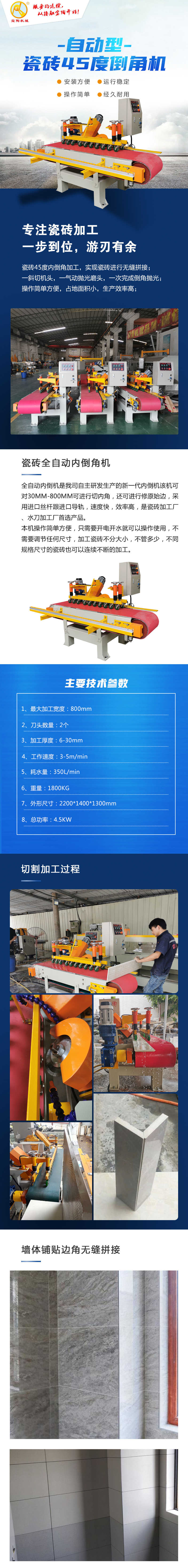 1200型瓷磚全自動(dòng)倒內(nèi)角機(jī),本機(jī)操作簡(jiǎn)單方便,只需要接電開水就可以操作使用,不需要調(diào)節(jié)任何尺寸,加工瓷磚不分大小,不管多少,不同規(guī)格尺寸的瓷磚也可以連續(xù)不斷的加工,速度快,效率高,耗電量低。瓷磚45度內(nèi)倒角加工,一般都用在墻轉(zhuǎn)角處兩塊倒過角的瓷磚進(jìn)行拼接。適用范圍:非常適合瓷磚加工廠,以及工程工地上使,配合全自動(dòng)三刀數(shù)控切割機(jī),切割+內(nèi)外倒角。