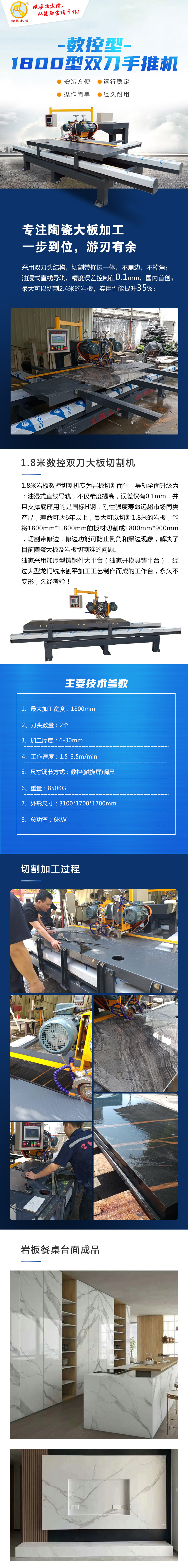 1800型數(shù)控雙刀手推式切割機最大加工尺寸1800mm,將1800mm*900mm的陶瓷大板、巖板切割成900mm*900mm,采用前后2個刀頭加工的方式,切割帶修邊功能,能有效避免切割后出現(xiàn)崩邊等情況,這種機械操作簡單,加工精度高,切割不崩邊,是加工陶瓷大板、巖板非常理想的一款機械。