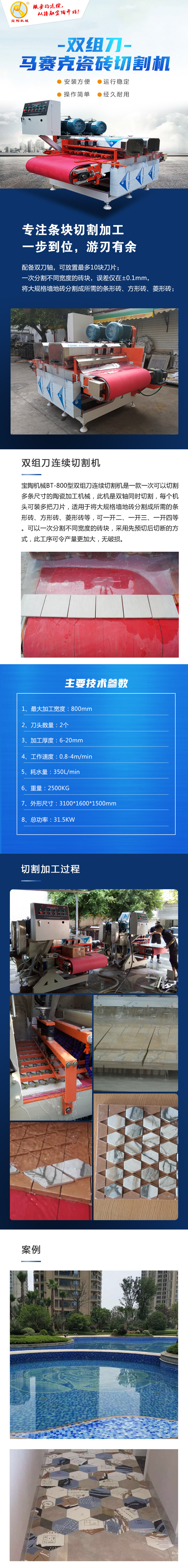 BT-800型雙組刀自動(dòng)切割機(jī)適用于用拋光磚分割成各種規(guī)格的高檔馬賽克,尺寸最小可分割10mm×10mm及各種形狀,如菱形、六角型等,分割中可同時(shí)進(jìn)行倒面角,完全不需要人手再加工,本機(jī)具有機(jī)械性能穩(wěn)定,在分割小形馬賽克時(shí),可壓穩(wěn)磚塊,確保分割開的小形磚塊不會(huì)飛出及效率高,質(zhì)量好等特點(diǎn)。