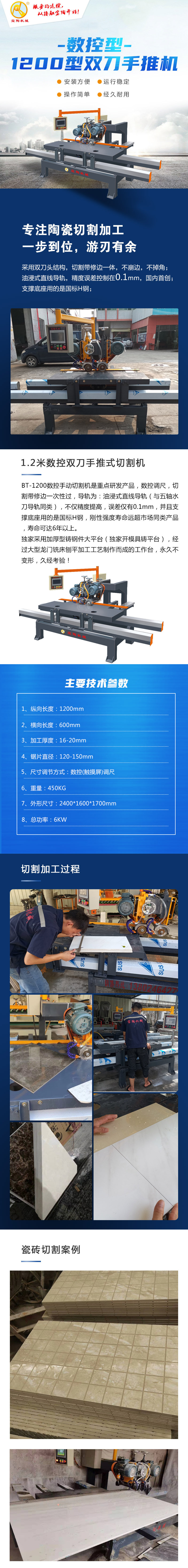 1.2米數(shù)控雙刀手推式切割機,切割帶修邊一次性過,導軌為:油浸式直線導軌(與五軸水刀導軌同類),不僅精度提高,誤差僅有0.1mm,并且支撐底座用的是國標H鋼,剛性強度壽命遠超市場同類產(chǎn)品,壽命可達6年以上。